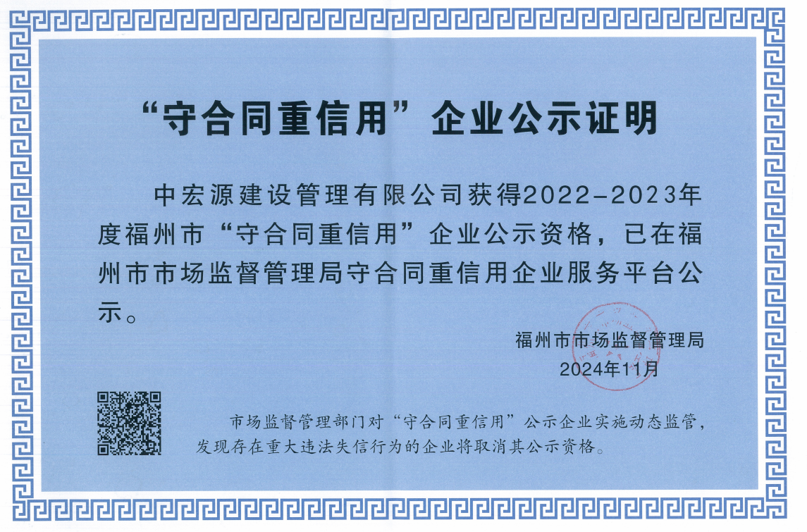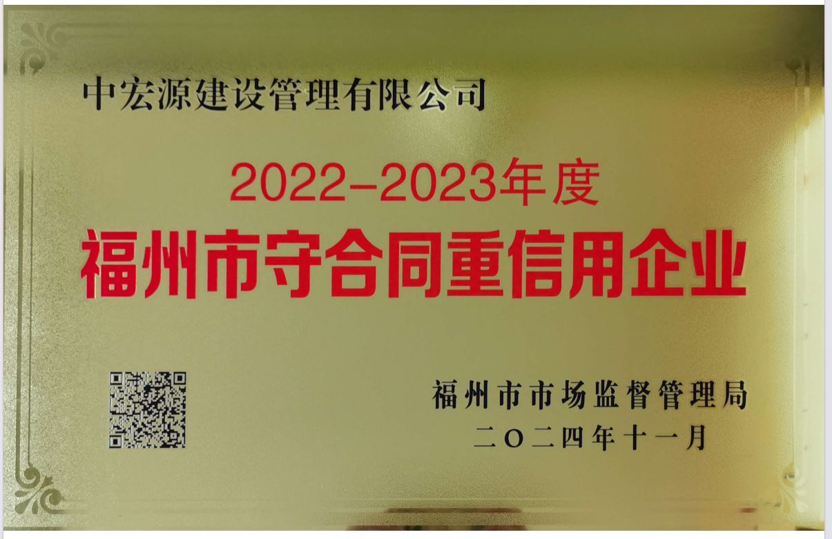 喜報|中宏源建設(shè)管理有限公司榮獲 “2022 - 2023年度福州市守合同重信用企業(yè)”稱號