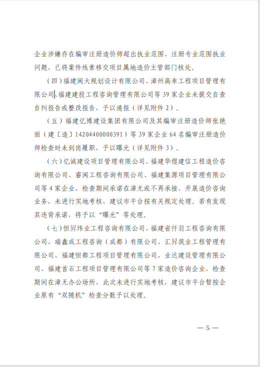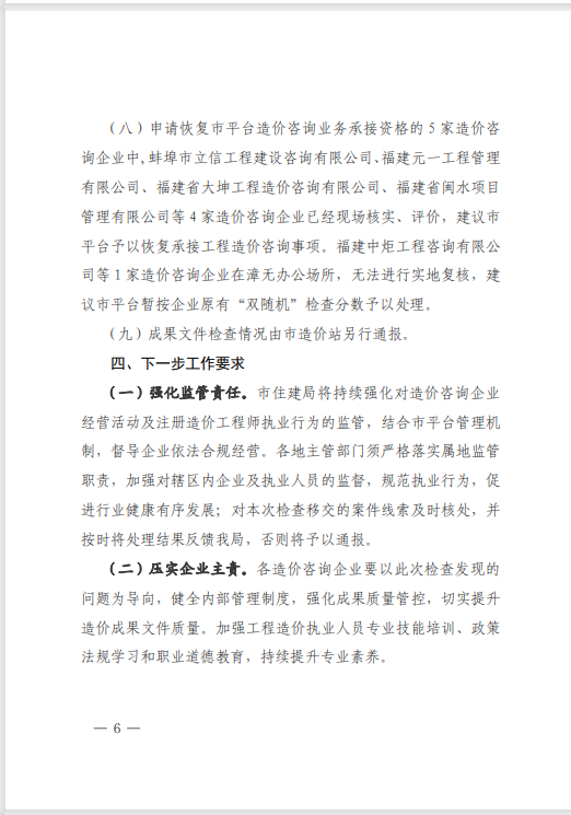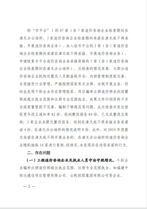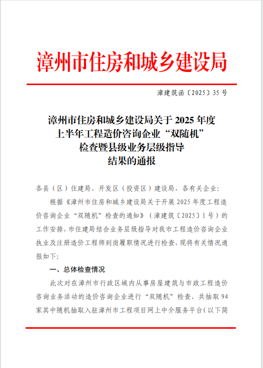 近日,漳州市住房和城鄉(xiāng)建設(shè)局完成2025年度上半年工程造價(jià)咨詢企業(yè)“雙隨機(jī)”檢查暨縣級(jí)業(yè)務(wù)層級(jí)指導(dǎo)工作,對(duì)在漳州市行政區(qū)域內(nèi)從事房屋建筑與市政工程造價(jià)咨詢業(yè)務(wù)活動(dòng)的94家企業(yè)進(jìn)行了檢查。中宏源建設(shè)管理有限公司憑借在多方面的出色表現(xiàn),得到了通報(bào)表揚(yáng)。