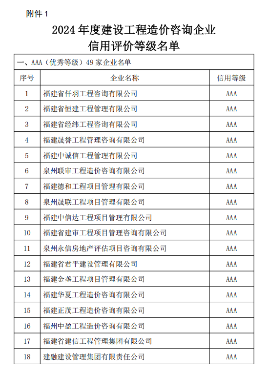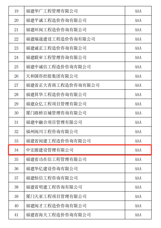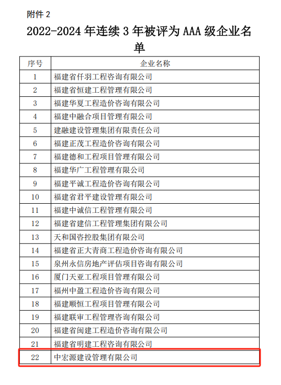 近日,泉州市住房和城鄉(xiāng)建設(shè)局公布了《2024年度造價(jià)咨詢企業(yè)信用評(píng)價(jià)等級(jí)及連續(xù)3年被評(píng)為AAA級(jí)企業(yè)名單》,中宏源建設(shè)管理有限公司憑借卓越的服務(wù)質(zhì)量、規(guī)范的管理體系和良好的市場(chǎng)信譽(yù),再次榮獲AAA級(jí)信用評(píng)價(jià),并成功入選“連續(xù)3年被評(píng)為AAA級(jí)企業(yè)”名單。